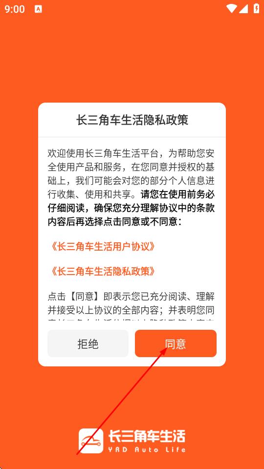 1、打開長(zhǎng)三角車生活A(yù)PP,在隱私政策頁(yè)面點(diǎn)擊同意。