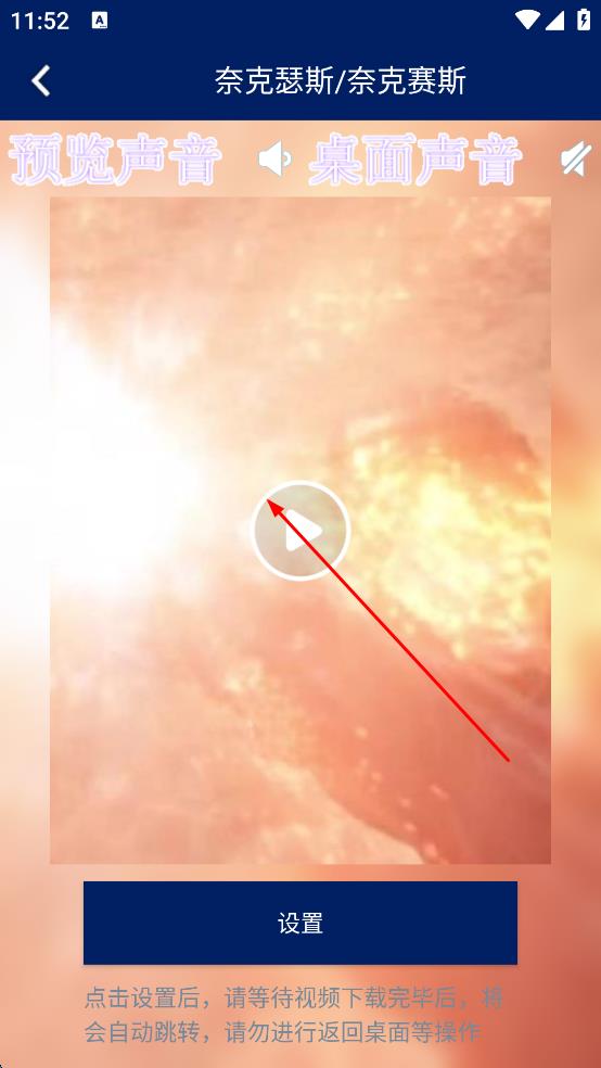 3、預(yù)覽結(jié)束后,點(diǎn)擊“設(shè)置”按鈕,等待視頻下載完畢,再點(diǎn)擊“設(shè)置壁紙” ,即可將該動(dòng)態(tài)壁紙應(yīng)用到桌面。