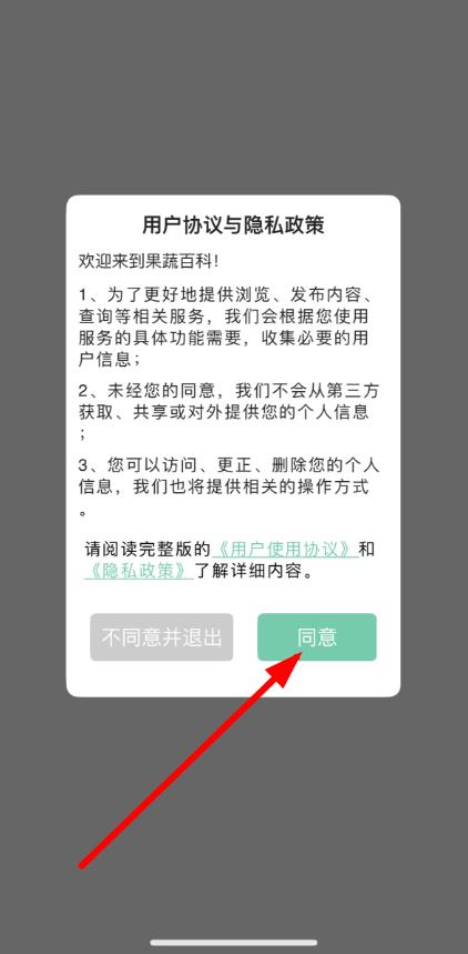 1、打開果蔬百科全說app,在彈出的用戶協(xié)議與隱私政策界面點(diǎn)擊同意。