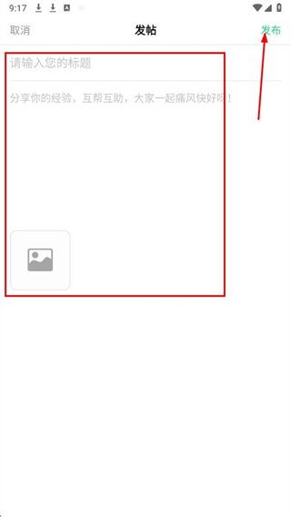 3、在發(fā)帖頁(yè)面,輸入標(biāo)題和內(nèi)容,可添加圖片,點(diǎn)擊右上角的發(fā)布,完成發(fā)帖操作。