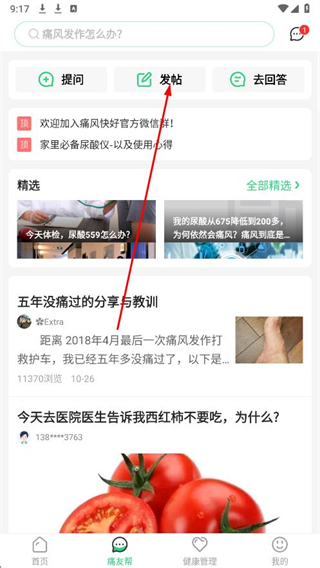 2、在痛友幫頁(yè)面,點(diǎn)擊發(fā)帖。
