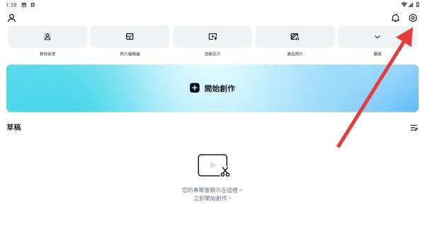1、打開CapCut軟件,進(jìn)入主界面若已登錄,保持主界面狀態(tài),點(diǎn)擊主界面右上角的齒輪形設(shè)置圖標(biāo)。