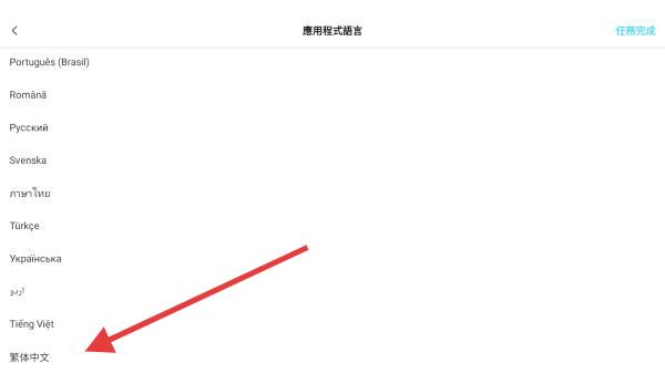 3、點(diǎn)擊語言選項,在彈出的語言列表中滑動至底部,找到簡體中文或繁體中文,點(diǎn)擊選中該選項。