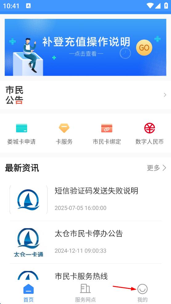 1、打開太倉市民卡APP,進入首頁后,點擊頁面右下角“我的”按鈕。