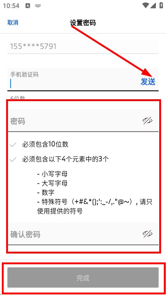 4、在設(shè)置密碼頁面,點擊發(fā)送獲取手機(jī)驗證碼,輸入驗證碼后,按照密碼設(shè)置要求設(shè)置密碼,確認(rèn)密碼后點擊完成即可。