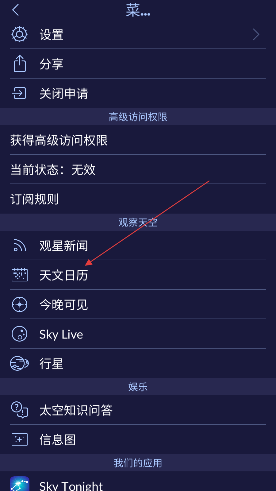 2、在功能菜單頁(yè)面中,找到天文日歷選項(xiàng)并點(diǎn)擊,進(jìn)入天文日歷頁(yè)面。