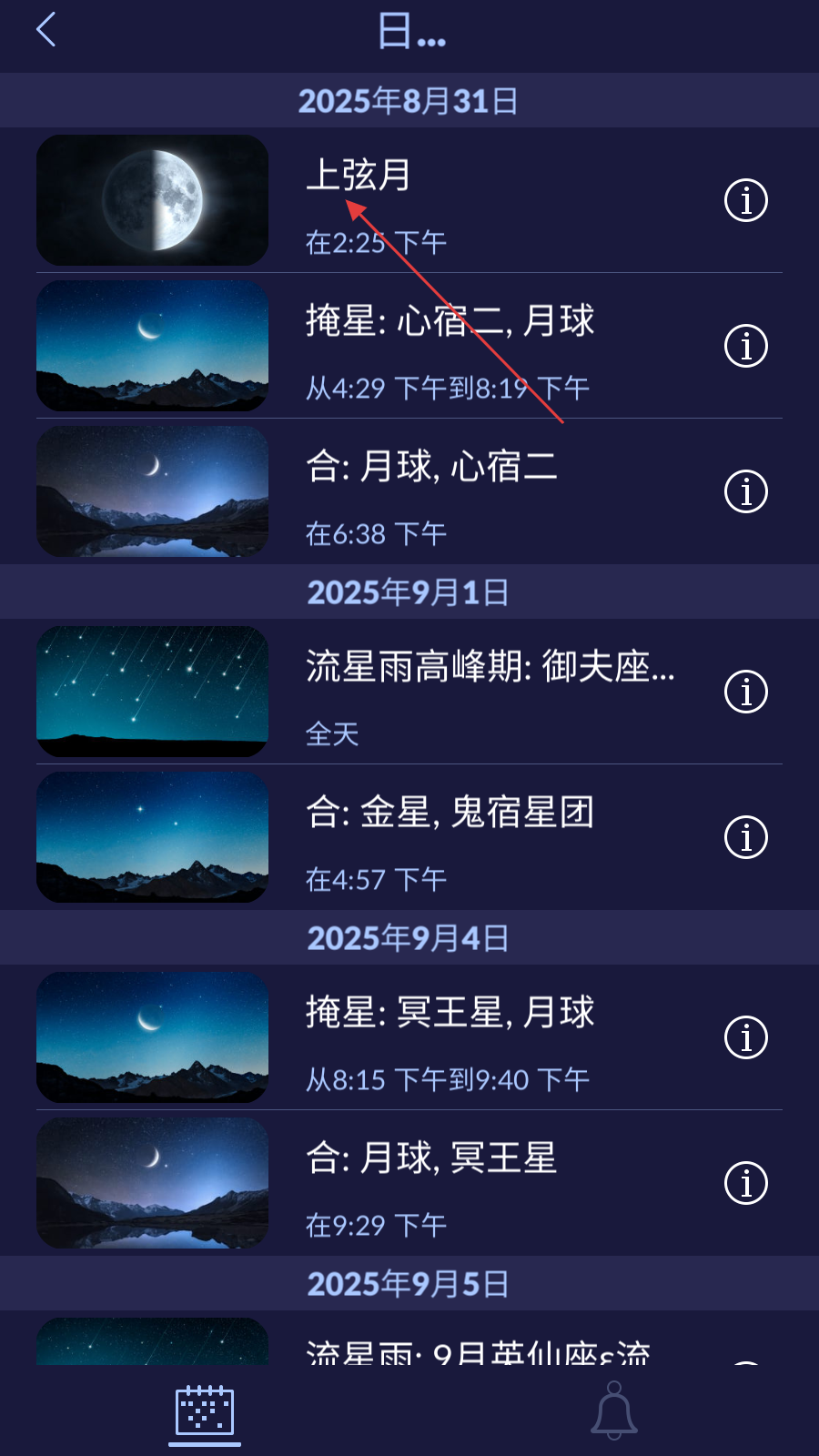 3、在天文日歷頁(yè)面,可瀏覽不同日期的天文事件,點(diǎn)擊可查看該事件的詳細(xì)時(shí)間、地點(diǎn)及天文原理說(shuō)明。
