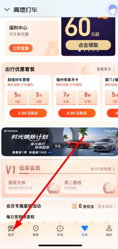 1、打開高德地圖APP,點(diǎn)擊首頁(yè)底部的首頁(yè)按鈕。