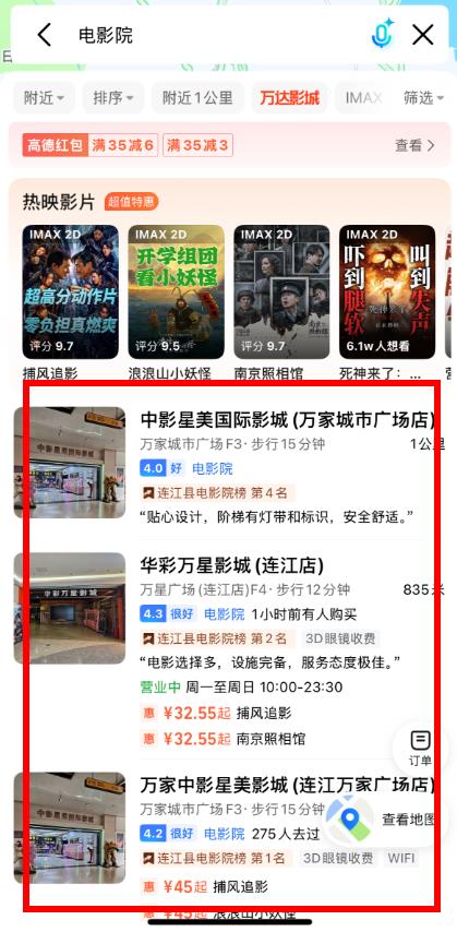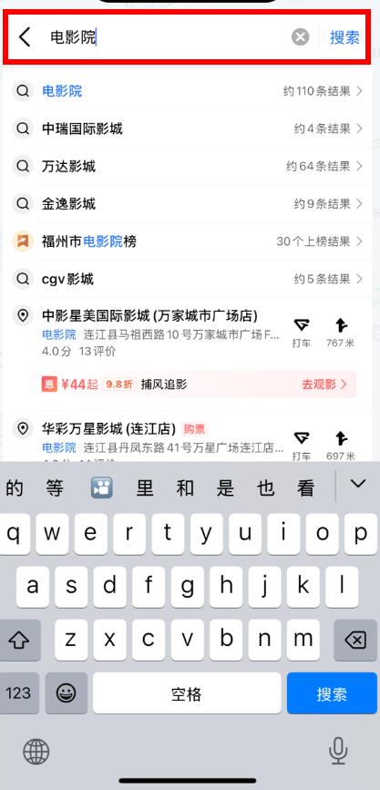 3、搜索結(jié)果頁(yè)面會(huì)顯示附近的電影院,包括名稱、距離、評(píng)分等信息。