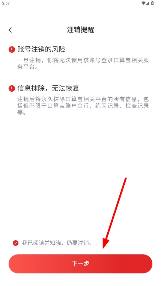 4、在注銷提醒頁面,勾選我已閱讀并知曉,仍要注銷,然后點擊下一步按鈕。