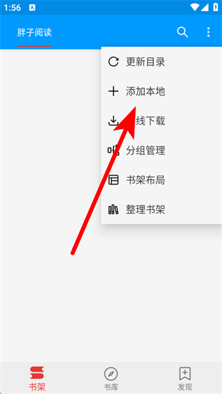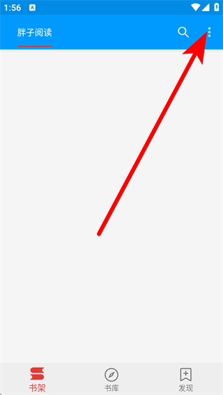 1、在胖子閱讀書架頁面,點擊右上角更多選項,彈出功能菜單。