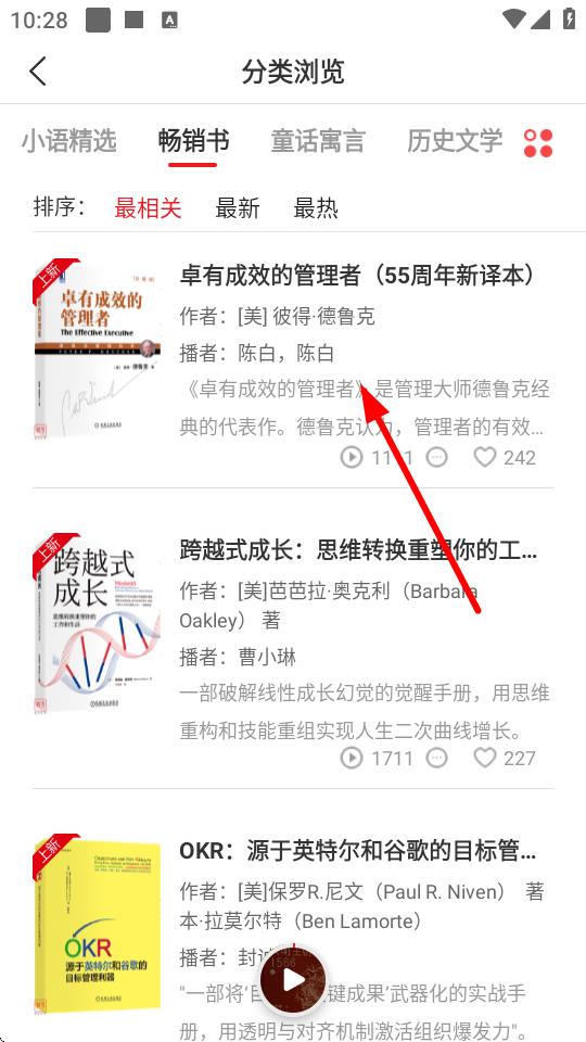 2、在分類瀏覽頁面中,找到想要聽的書籍,比如卓有成效的管理者55周年新譯本,點擊該書籍進入詳情頁。