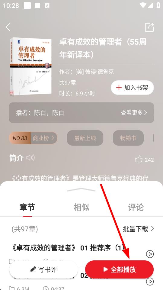 3、在書籍詳情頁中,點擊下方紅色的全部播放按鈕,即可開始播放該書籍內(nèi)容。