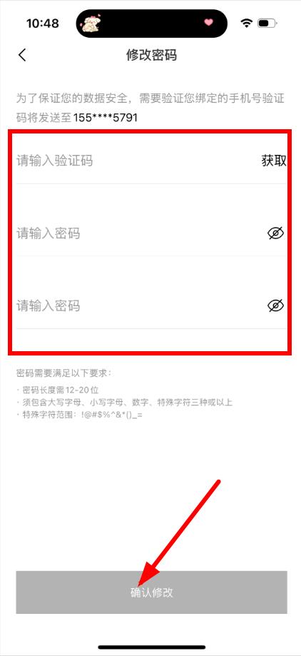 5、在修改密碼頁(yè)面,輸入驗(yàn)證碼、新密碼等,點(diǎn)擊確認(rèn)修改,完成密碼修改操作。