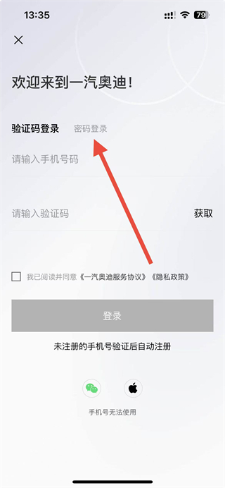 3、在登錄界面,找到密碼登錄選項(xiàng)并點(diǎn)擊,切換至密碼登錄頁(yè)面。