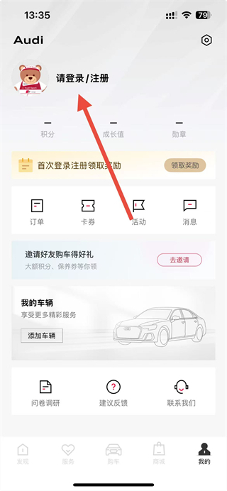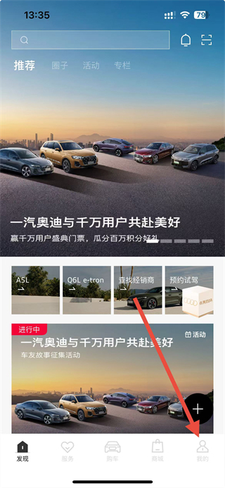 1、在一汽奧迪APP發(fā)現(xiàn)頁(yè)面,點(diǎn)擊右下角我的選項(xiàng),進(jìn)入個(gè)人中心界面。