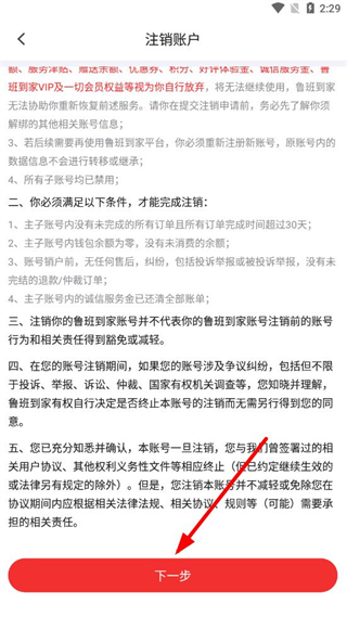 5、在注銷賬戶頁面閱讀相關須知后,點擊下一步,按照提示完成賬號注銷操作。