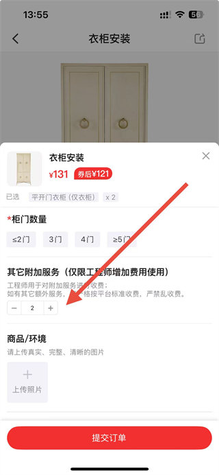 4、在下單頁面,調(diào)整數(shù)量為2,填寫柜門數(shù)量等信息后,點擊提交訂單按鈕即可。