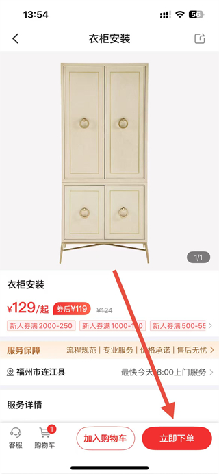 3、選擇點擊后,進入衣柜安裝頁面后,點擊立即下單按鈕。