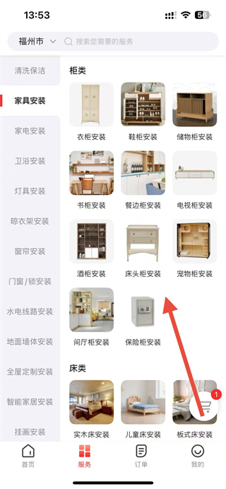 2、在服務頁面,根據(jù)個人選擇要安裝的家具類型。