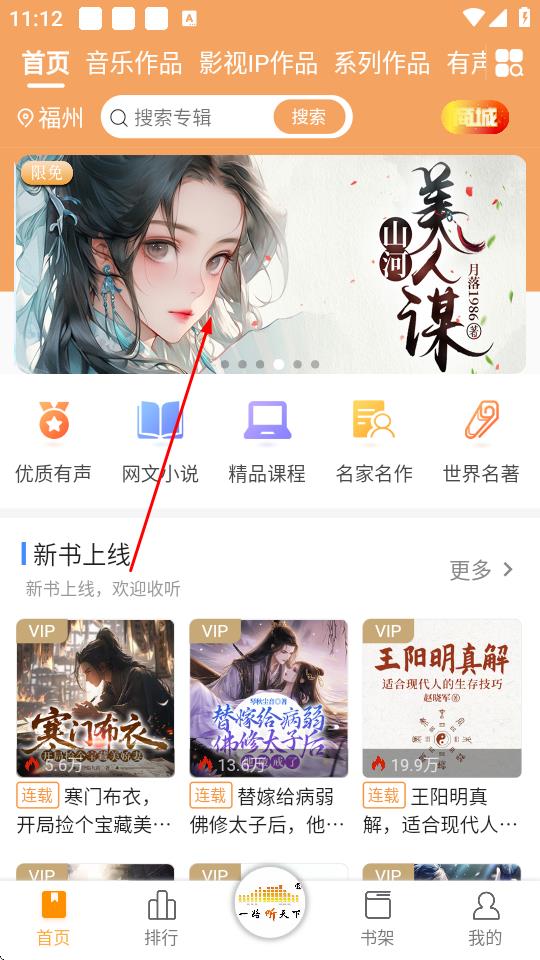 1、打開一路聽天下APP,在首頁(yè)找到想聽的小說(shuō),點(diǎn)擊封面圖進(jìn)入詳情頁(yè)。