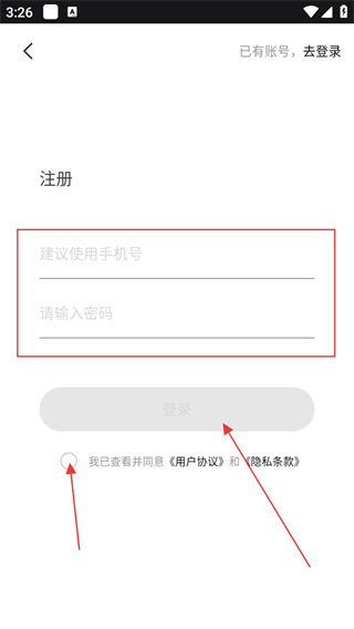 4、輸入手機(jī)號(hào)、密碼,勾選協(xié)議即可。