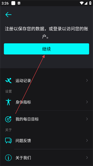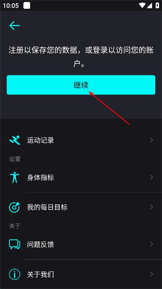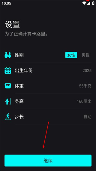 1、在設(shè)置頁面確認(rèn)性別、出生年份、體重、身高等信息后,點(diǎn)擊“繼續(xù)”。