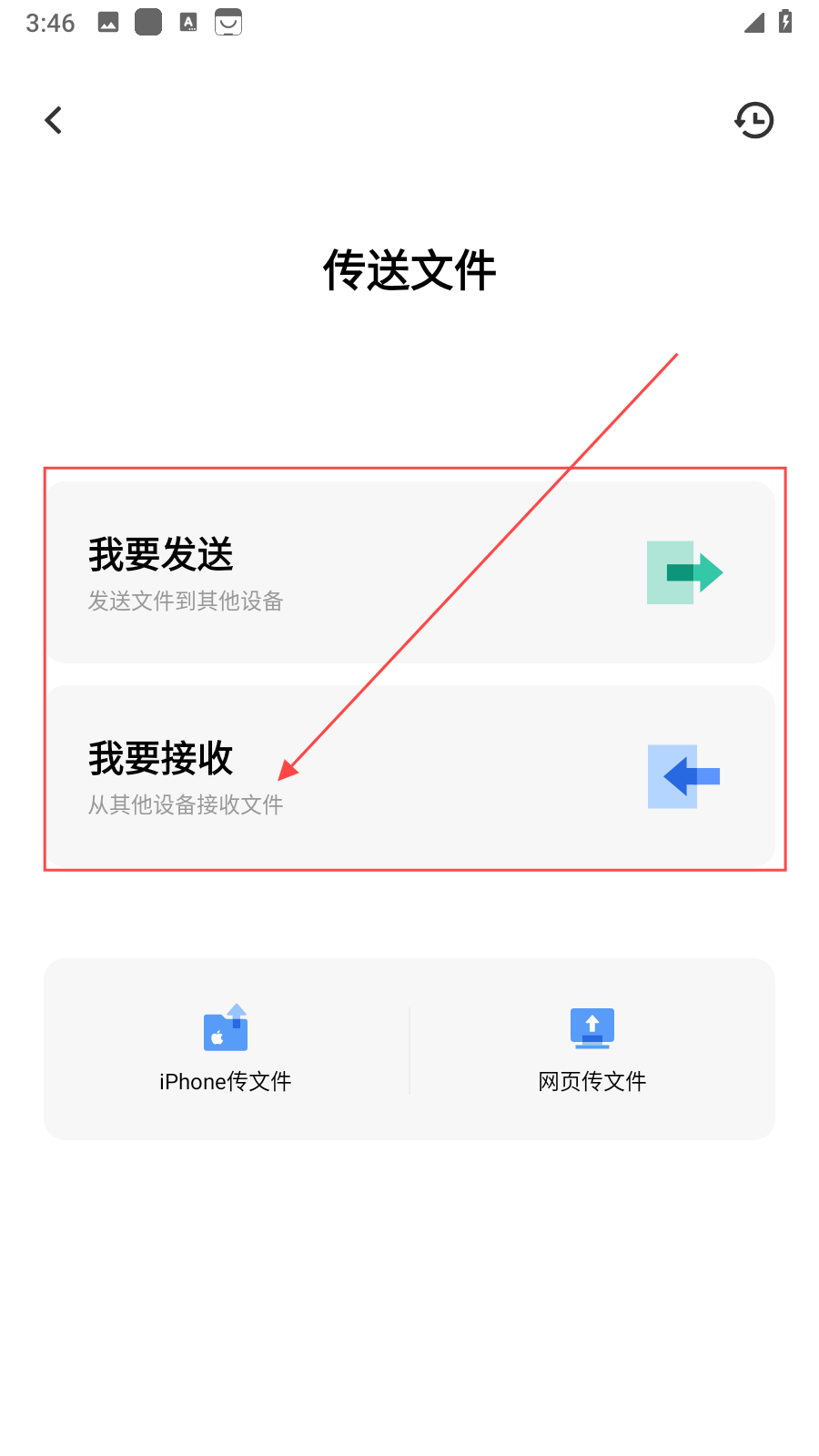 1、打開互傳應(yīng)用,在主界面點(diǎn)擊傳送文件板塊進(jìn)入傳送文件頁面,點(diǎn)擊我要接收選項(xiàng),此時應(yīng)用開始搜索可連接的設(shè)備。