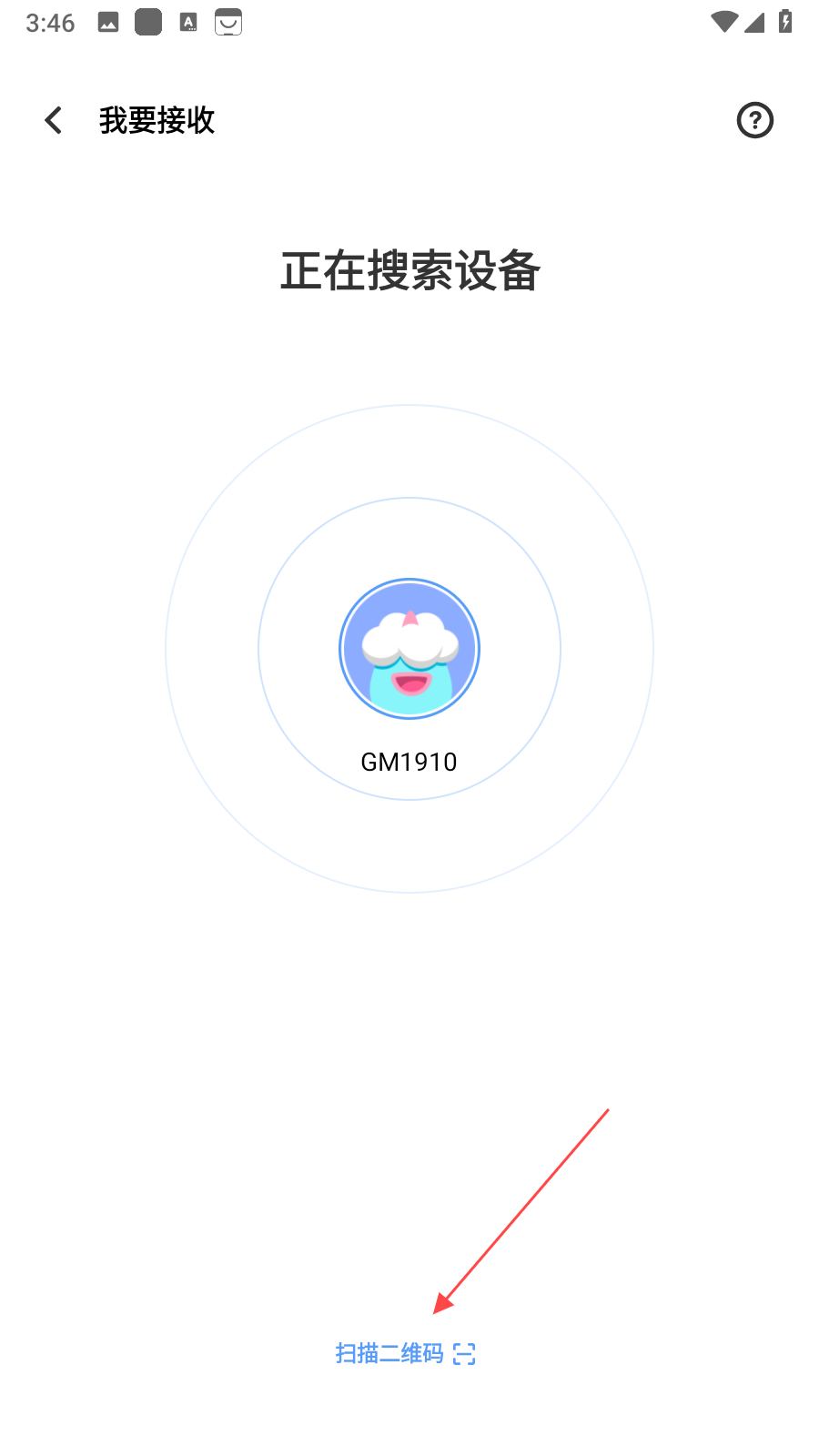 2、若搜索到發(fā)送方設(shè)備,確認(rèn)是目標(biāo)設(shè)備后等待連接,若未搜索到,點(diǎn)擊頁面中的掃描二維碼,準(zhǔn)備掃描發(fā)送方生成的二維碼。