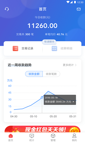 2、進(jìn)入應(yīng)用首頁(yè),查看進(jìn)入的收款數(shù)據(jù)和交易記錄