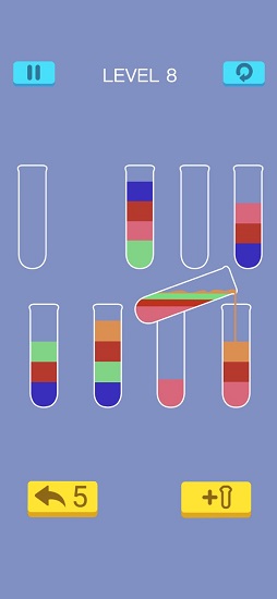 輕松有趣的顏色分類游戲,不僅益智健腦,還能助你輕松緩解壓力,點(diǎn)擊試管,傾倒試管中的液體,將試管中裝滿同一顏色液體即可。需要注意的是:只有相同顏色的液體才可以互相傾倒入試管內(nèi)