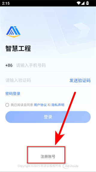 1、打開明源智慧工程APP,點(diǎn)擊注冊(cè)賬號(hào)按鈕,進(jìn)入注冊(cè)信息填寫頁面。