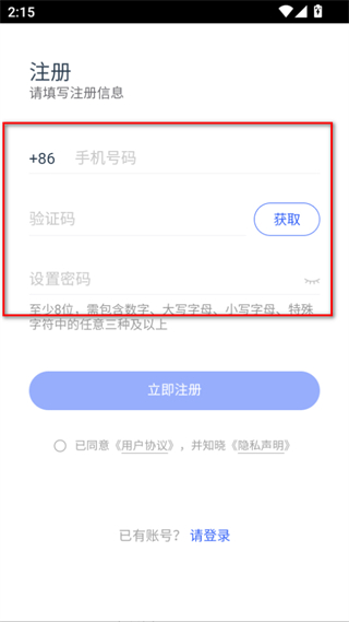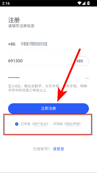 3、勾選已同意用戶協(xié)議,并知曉隱私聲明后,點(diǎn)擊立即注冊(cè)按鈕,完成賬號(hào)注冊(cè)。