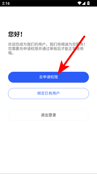 4、注冊(cè)完成后,點(diǎn)擊去申請(qǐng)權(quán)限按鈕,按照提示申請(qǐng)權(quán)限并通過審核,即可正常使用APP。