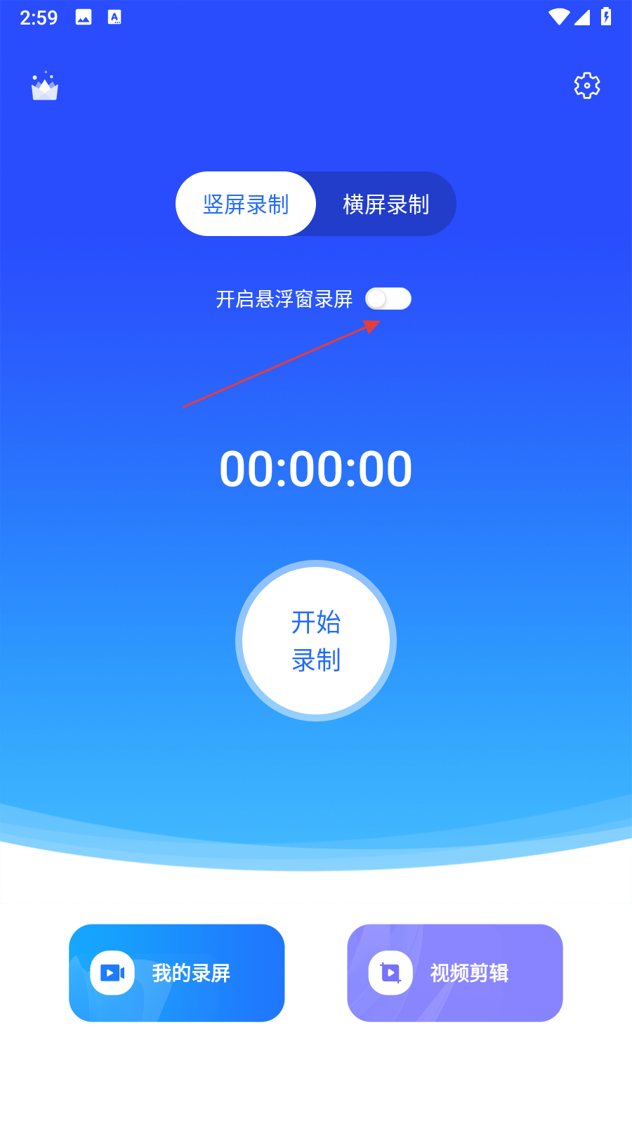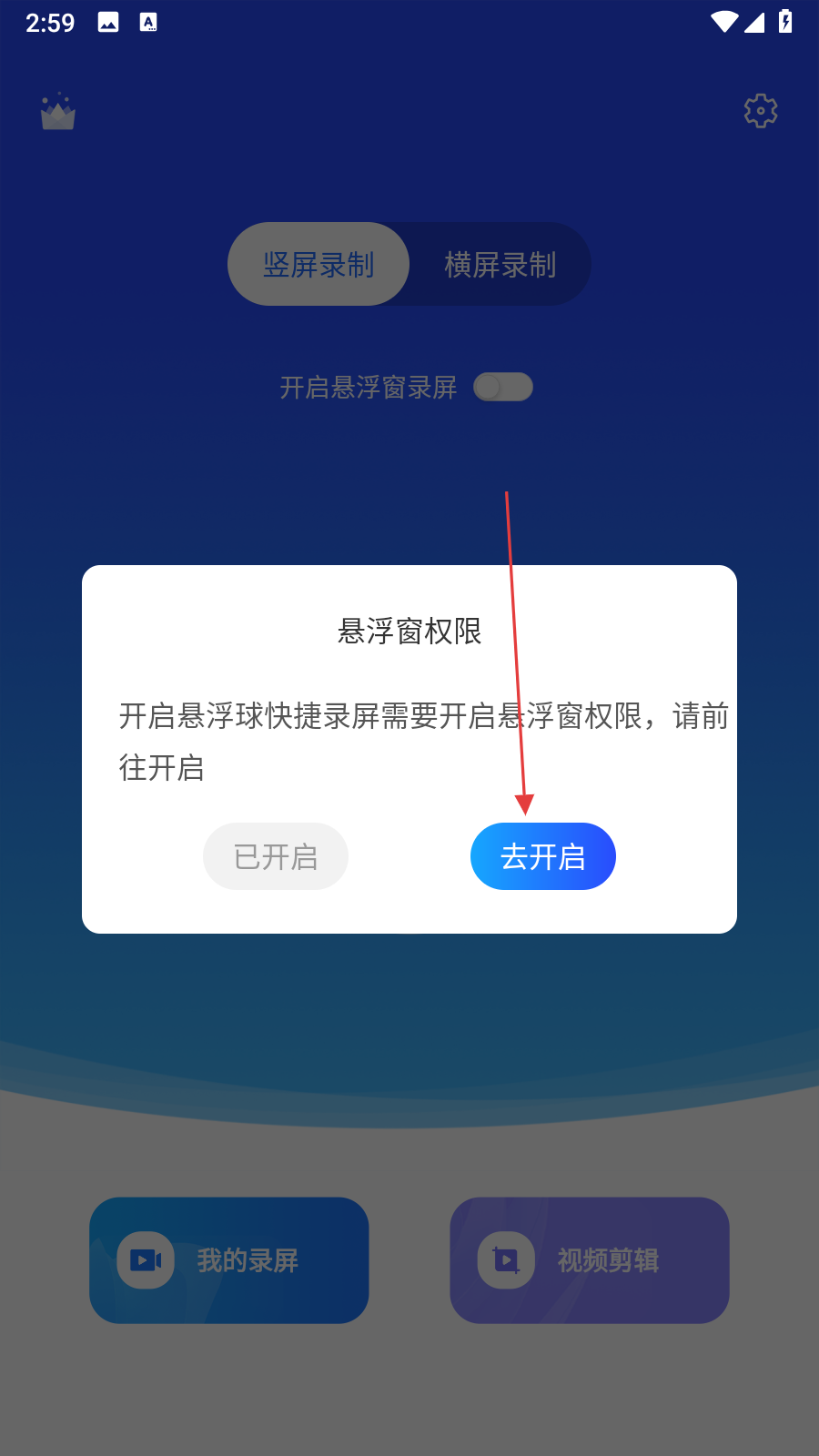 1、打開錄屏寶應(yīng)用,在主界面找到開啟懸浮窗錄屏開關(guān),點(diǎn)擊該開關(guān),會彈出懸浮窗權(quán)限提示框。