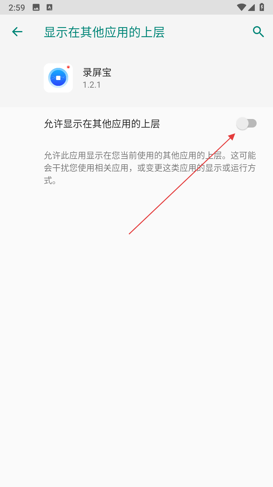 3、在顯示在其他應(yīng)用的上層設(shè)置頁面,找到允許顯示在其他應(yīng)用的上層開關(guān),點(diǎn)擊該開關(guān)將其開啟,即可打開錄屏寶的懸浮窗功能。