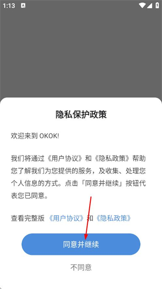 1、打開(kāi)OKOK國(guó)際版APP,在隱私保護(hù)政策彈窗中點(diǎn)擊同意并繼續(xù)。