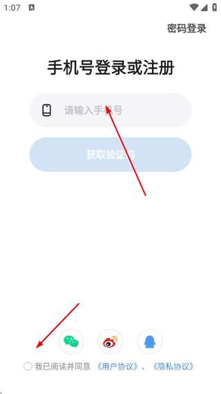 2、在手機(jī)號(hào)登錄或注冊(cè)頁(yè)面輸入手機(jī)號(hào)碼,勾選用戶協(xié)議,點(diǎn)擊獲取驗(yàn)證碼。