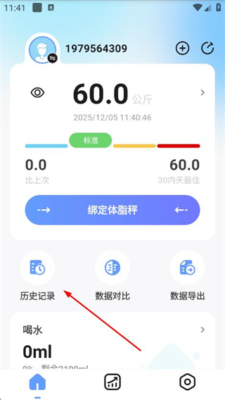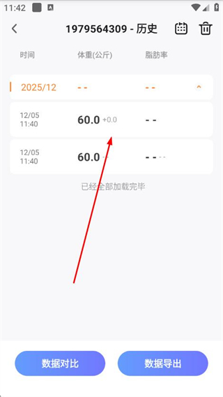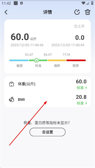 3、在詳情頁(yè)面即可查看該條記錄的體重、BMI等具體歷史數(shù)據(jù)。