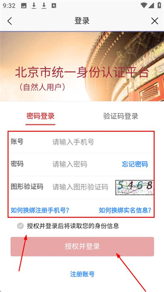 4、輸入手機(jī)號(hào)、密碼、圖形驗(yàn)證碼,勾選授權(quán)并登錄后將讀取您的身份信息,點(diǎn)擊授權(quán)并登錄。