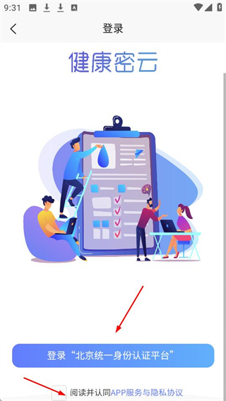 3、在登錄頁(yè)面,勾選服務(wù)與隱私協(xié)議,點(diǎn)擊登錄北京統(tǒng)一身份認(rèn)證平臺(tái)’。