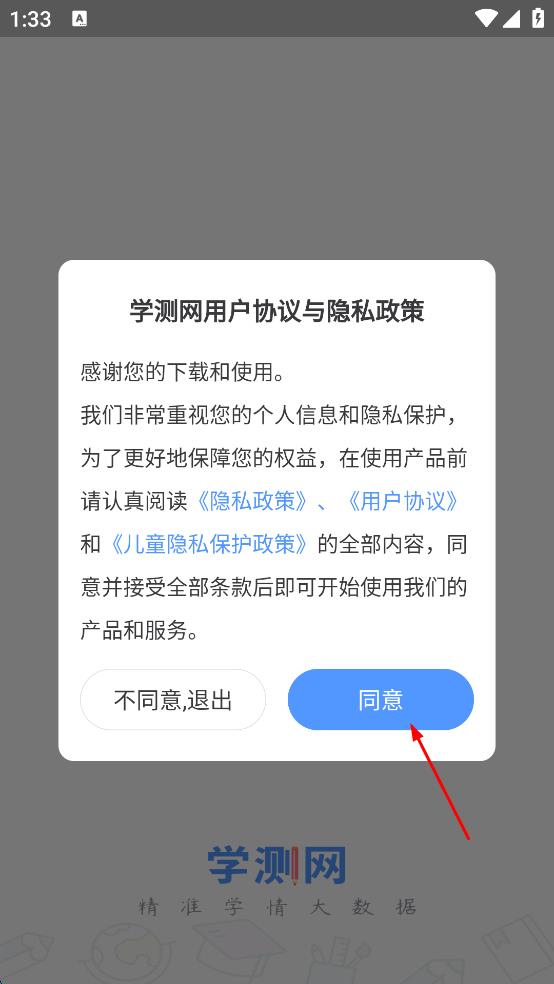 1、打開學(xué)測(cè)網(wǎng),在彈出的用戶協(xié)議與隱私政策頁面,點(diǎn)擊同意,進(jìn)入學(xué)測(cè)網(wǎng)登錄頁面。