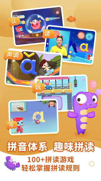 五大環(huán)節(jié)學(xué)拼音,課程體系更科學(xué)——認(rèn)拼音:拼音字母講解 字母字形輕松掌握;讀拼音:真人口型示范,字母跟讀發(fā)聲準(zhǔn)確,ai童聲識(shí)別,精準(zhǔn)判斷孩子發(fā)音;寫拼音:真人握筆書寫,字母書寫筆畫標(biāo)準(zhǔn);學(xué)聲調(diào):創(chuàng)意動(dòng)畫演示,聲調(diào)學(xué)習(xí)科學(xué)有趣;玩拼音:拼音游戲練習(xí),強(qiáng)化訓(xùn)練加深記憶;