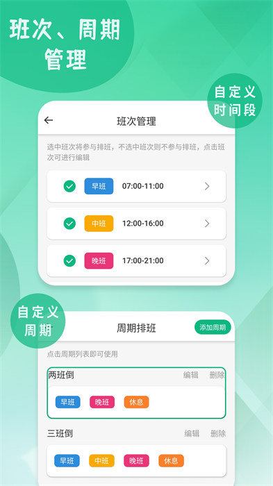 【排班功能】可選擇字的顏色、可自定班別名稱與時間、班別可作新增與刪除、群組班表編輯與貼上等;