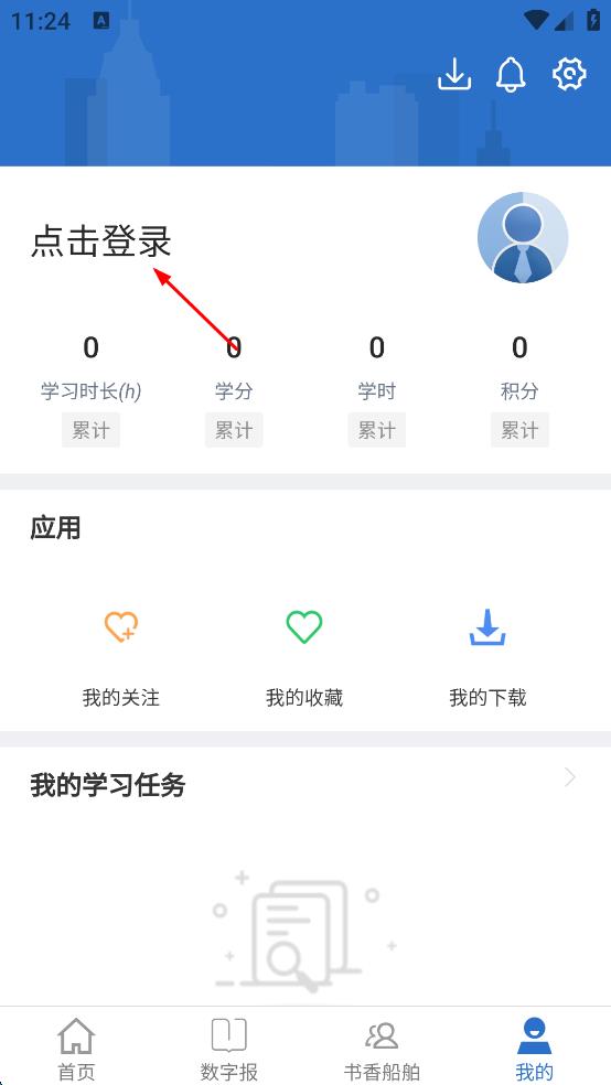 3、進入“我的”頁面,頁面上有“點擊登錄”提示,還有學習時長、學分等累計數(shù)據(jù),點擊“點擊登錄”字樣。
