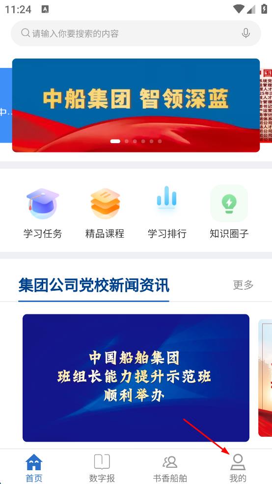 2、進入中船e學主界面,界面下方有“首頁”“數(shù)字報”“書香船舶”“我的”等選項,點擊“我的”選項。