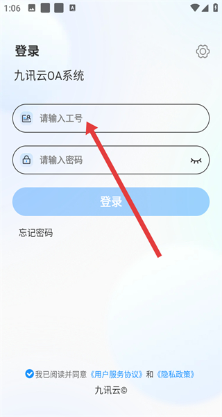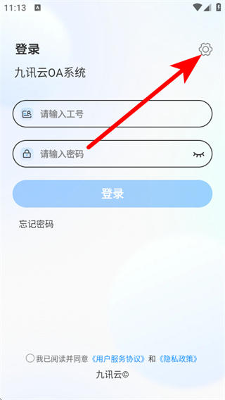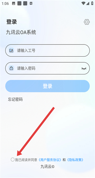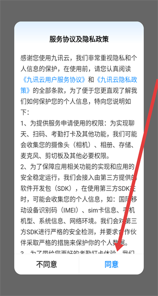 1、打開九訊云APP,點擊同意按鈕,確認服務(wù)協(xié)議及隱私政策,進入登錄界面。