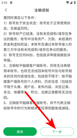 4、在注銷須知的頁面,點擊下一步,按照提示完成賬號注銷操作。
