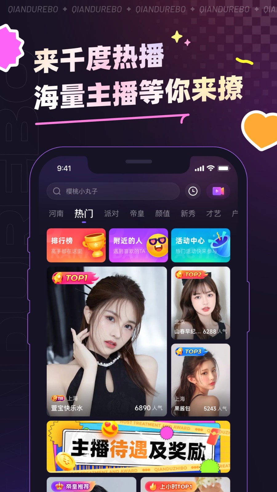 千度熱播擁有各種各樣的直播內(nèi)容,還擁有國外主播。隨時隨地直播交友,各種高顏值主播給你不一樣的精彩。每個主播能歌善舞精彩不凡,高清畫質(zhì)不會卡頓模糊,讓您仿佛面對面交流。各種貼心功能給您最好的服務(wù),隨時隨地開啟便可觀看直播于自己喜歡的主播交流。