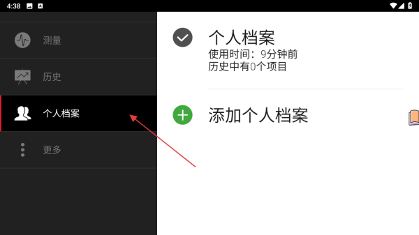 1、打開(kāi)24小時(shí)心率監(jiān)測(cè)儀應(yīng)用,點(diǎn)擊左側(cè)菜單欄中的個(gè)人檔案選項(xiàng),進(jìn)入個(gè)人檔案管理界面,能看到使用時(shí)間和歷史項(xiàng)目數(shù)量等信息,還可點(diǎn)擊添加個(gè)人檔案進(jìn)行操作。
